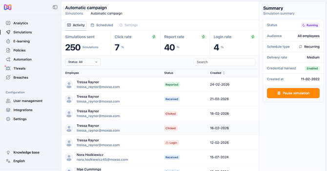 Once a Simulation is actually launched, it will send a first round of emails to the targeted employees but from then on it will follow our algorithm logic, adapting individual send cadences to the employees risk levels.