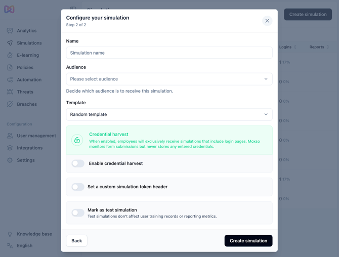 Follow the steps and select Create simulation. This will create a draft and from there, you can click Send test to see what our simulation templates look like.