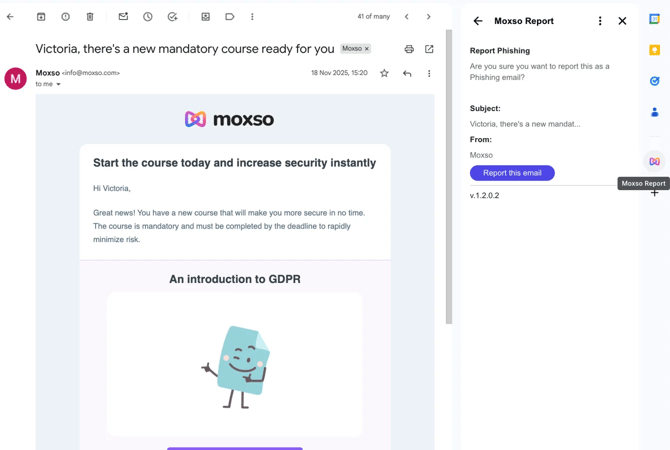 When an employee wants to report suspicious emails as phishing, they click on the Moxso Report Button directly in their inbox.