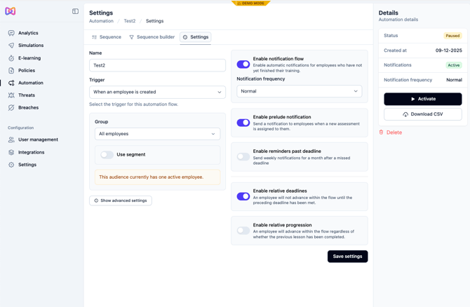 8. In advanced settings, you can select if you wish employees to be assigned lessons even if they have already completed them or to go through the automation more than once.