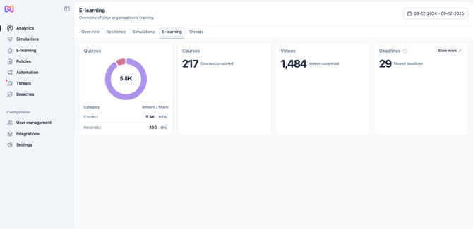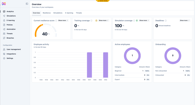 You will need to access the Analytics tab on the left of your Admin. This section compiles data and analysis from the various features of Moxso, including phishing Simulations, Training and Reporting.