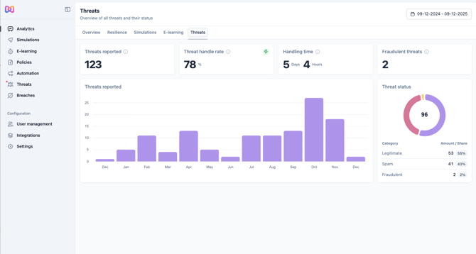 - You can find here data points on how many threats were reported, handled and in how long this occurred. A threat counts as handled once you have marked it to be either fraudulent, spam, or legitimate.
